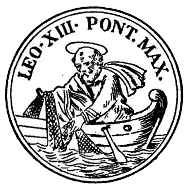 Il représente saint Pierre pêchant au filet dans sa barque, une évocation de la fameuse pêche abondante que réalisa l'apôtre à l'endroit où Jésus lui dit de jeter ses filets, et de l'exhortation qu'il lui donna ensuite « Sois sans crainte, désormais ce sont des hommes que tu prendras » (Luc, 5).