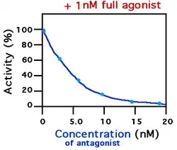 Si ces deux molécules agissent sur le même récepteur cellulaire, on parle d'antagonisme compétitif – la concentration efficace médiane (CE50) sera modifiée mais pas l'effet maximal (Emax). Si l'antagoniste agit sur un autre site de fixation on dira qu'il est non-compétitif (ou « allostérique » ou encore « irréversible ») ; cela aura pour effet de modifier la valeur de l'Emax, mais l'EC50 restera identique.