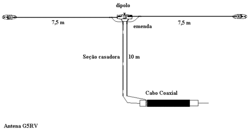 Cette antenne est un dipôle constitué de deux fils de 15,54 mètres de chaque côté, espacé de 12 cm au centre, avec un "twin lead" d'une impédance de 450 Ω) de 10,35 mètres, d'un balun 1/1 pour brancher un câble coaxial d'une impédance de 50 Ω) pour le brancher sur la radio.