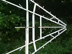 Le réseau de dipôles log-périodique comporte des dipôles de longueurs croissantes alimentés par une ligne. Le croisement de la ligne entre chaque élément alimente deux éléments successifs en opposition dans le modèle le plus classique.