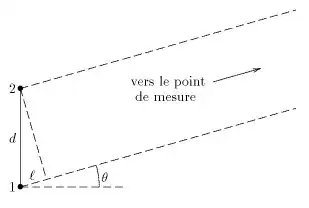 Calculons le champ électrique produit par cette paire d'antennes à une distance très grande des antennes. C’est-à-dire que est très grand comparée à la longueur d'onde et que . Comme la distance est grande, l'angle est le même pour les deux antennes et le champ produit par chacune sera aussi le même : et . Mais si l'amplitude est la même, la phase ne le sera pas, parce que l'antenne 2 est plus proche du point de mesure que 1. Le champ produit par l'antenne 2 arrivera secondes plus tôt que le champ produit par l'antenne 1. Autrement dit, le champ produit par l'antenne 2 sera en avance de phase de :