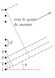 Soient n sources alignées alimentées en phase séparées par une distance entre chacune. Examinons le champ lointain rayonné dans la direction . En prenant comme référence de phase celle du champ lointain de l'élément rayonnant 1 (en anglais : radiator), , le champ lointain de l'élément rayonnant 2 aura une avance de phase de . L'élément rayonnant numéro 3 aura une avance de phase de et de même pour les suivants. Pour calculer le champ total, il suffit d'ajouter tous les champs en tenant compte du déphasage. Comme toutes les amplitudes sont égales :