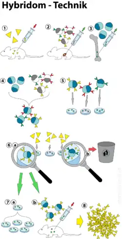 Ensuite, l'animal est sacrifié et les cellules B sont isolées à partir de la rate (2). Celles-ci, ne pouvant se multiplier mais produisant les anticorps désirés, sont fusionnées (4) avec des myélomes (cellules cancéreuses, donc aptes à une division cellulaire rapide et immortelles). Cette étape de fusion peut être effectuée en utilisant le PEG ou par électroporation. Ces cellules sont ensuite mises en culture ; ces hybridomes ayant la propriété des cellules cancéreuses, elles se multiplient rapidement et indéfiniment.