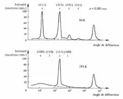 Expérimentalement, on peut mettre en évidence l'apparition de ce désordre magnétique (tendance des moments magnétiques à s'orienter aléatoirement) grâce à la diffraction de neutrons[13]. En effet, si les électrons peuvent diffracter selon la loi de Bragg grâce aux interactions électrostatiques des atomes dans les structures cristallines, on peut avoir une diffraction des neutrons par interaction des moments magnétiques, lorsqu'ils possèdent aussi un certain ordre. Ainsi, plus le matériau est ordonné, plus il comporte de plans de diffraction et donc un nombre de pics élevé en intensité en fonction de l'angle de diffraction. On rappelle qu'il y a diffraction lorsqu'on respecte les conditions de Bragg: ,