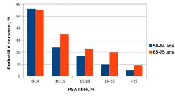 Risque de cancer de la prostate pour deux groupes d'âge, basé sur la fraction de PSA libre exprimée en % du PSA total[1].