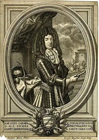 Antonio Carafa, issue de la puissante famille Carafa du royaume de Naples (alors possédé par les Habsbourg d'Espagne), entra en 1665 au service de l'Autriche, devint feld-maréchal en 1688, combattit les Turcs en Hongrie et prit sur eux Moukatcheve (Munkacz) et Belgrade la même année 1688.