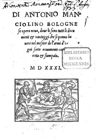 - ↑ (it) Antonio Manciolino, Opera Nova, Venise, Nicolo d'Aristotile, , 63 p. (lire en ligne)