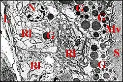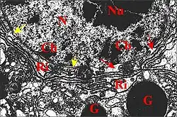 L’enveloppe nucléaire est en nette continuité avec le réticulum endoplasmique de sorte que leurs cavités peuvent communiquer largement (Fig.14 : flèches rouges). Ce dernier est remarquablement développé, en grande partie lisse (Fig.10,11,14,16) et forme des cisternae (dilatations) de taille très variable, s’enchevêtrant les unes dans les autres, correspondant aux "vacuoles" de la microscopie optique.