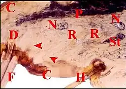Flèche simple : terminaison de l'organe gonoporal (C.H.).