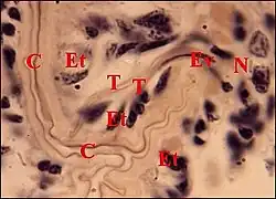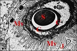 Le prolongement axonique n’a été qu’entrevu. Les dendrites des deux neurones de chaque unité renferment des s longitudinaux (Fig. ). D’après des documents photographiques aujourd’hui perdus, ils semblent comporter aussi des centrioles et un corps tubulaire n’existant peut être que dans un seul d’entre eux. Ces dendrites, accolés en couple, sont entourés par la gaine cuticulaire, très osmiophile, nette à leur contact, mal limitée extérieurement et allant rejoindre la papille pour s’y insérer (Fig. ).