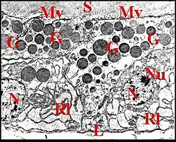 Les grains de sécrétion paraissent y naître près du pôle basal dans le réticulum endoplasmique (Fig.16). Ils sont régulièrement sphériques, homogènes, d’opacité variable, avec un contour très net comme tracé au compas mais parfois un peu " décollé " de la membrane qui les limite. Ils gagnent le pôle apical de l'adénocyte (Fig.10 à 12) ; leur contenu y est extrudé dans la lumière (Fig.15), parfois entre les pieds des microvilli et se joint au matériel sécrétoire qui l’emplit.Les autres organites sub-cellulaires sont de petites mitochondries sphériques (Fig.13,16), à crêtes estompées, à matrix très claire, siégeant surtout près du noyau dans le pôle basal et de petites vésicules apicales. Ces dernières paraissent vides mais ont une membrane très contrastée (vésicules recouvertes) et sont parfois libérées dans la lumière avec le contenu des grains (Fig.15). Bien qu’il n’ait pas été observé de dictyosomes individualisés, elles pourraient avoir une origine golgienne. La cohésion des adénocytes est assurée par de petites jonctions sub-apicales (desmosomes zonaires) (Fig.12).