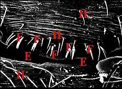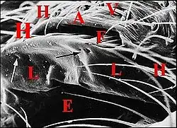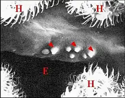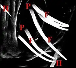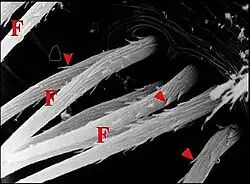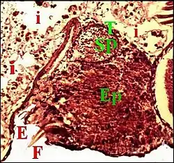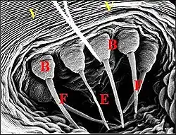 Dans les coupes histologiques (C.H.), à la loupe binoculaire et surtout au microscope électronique à balayage (M.E.B)[14], les fusules se présentent comme des structures de forme assez constante mais de disposition plus variable. Leur compte permet évidemment celui des corps acineux, donc des glandes prégonoporales, souvent difficile et parfois impossible dans les coupes histologiques (C.H.) lorsqu’elles y sont trop nombreuses. Soulignons qu'elles ne doivent pas être confondues avec les poils qui les entourent, surtout lorsqu'ils sont lisses (Fig. ), plutôt que barbelés (Fig. ).