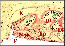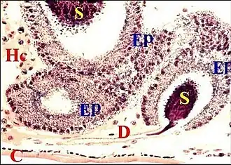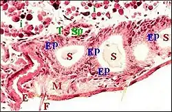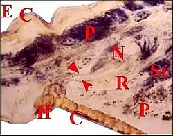 Juste avant d’aboutir à sa fusule, le canal traverse généralement un épiderme modifié (Fig.21,22). que Marples (1967) décrivit pour la première fois chez Hickmania dans une étude histologique rudimentaire. Cet épithélium, plus ou moins concave, déprimé en «cupule» ou «puits» (« pit ») (Fig.22), est formé par des cellules prismatiques hautes, à noyaux basaux, à cytoplasmes clairs, d’aspect «fibrillaire», pouvant renfermer des grains de pigment mélanique et est surmonté par un revêtement cuticulaire strié.