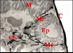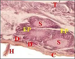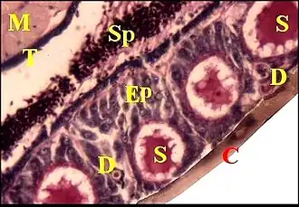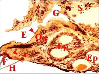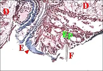 Le corps est formé par un épithélium simple (Fig.4 à 9) reposant sur une basale et non surmonté d’un revêtement cuticulaire. Ses cellules glandulaires ou adénocytes, prismatiques ou pyramidales, renferment des "boules" ou sphérules logées dans des "vacuoles" plus ou moins apparentes, déformant souvent le noyau et captant en général les colorants acides tels que le bleu d’aniline et l'éosine. Teintés également en violacé par l’hématoxyline de Mallory (Fig.7), ces grains de sécrétion réduisent le réactif de Schiff dans la méthode à l’APS (Fig.6,8). Ils passent ensuite dans la lumière et s’y accumulent sous forme d’une masse de sécrétion plus ou moins homogène et à contours festonnés (Fig. 5 à 9).