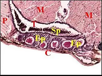 E,fente épigastrique - Ep, glandes épigastriques prégonoporales - G, gonopore - S, spermatozoïdes - T, canal commun terminal -