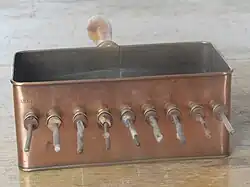 L'appareil d'Ingenhousz est une cuve de laiton à manche percée de plusieurs trous dans lesquels sont introduites des tiges de même géométrie mais de natures différentes.