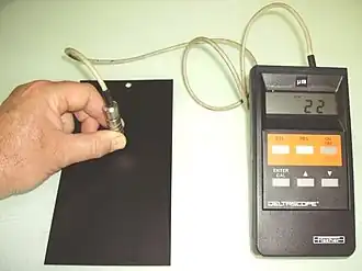 - courants de Foucault (eddy current en anglais), pour la mesure typique de l'épaisseur d'un revêtement isolant ou mauvais conducteur électrique sur métal (ou alliage) non ferreux ou sur certains aciers inoxydables. La mesure est permise si les conductivités électriques du revêtement et du support sont suffisamment différentes.