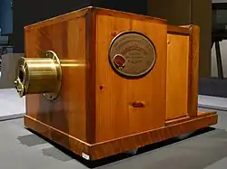 1839. Nicéphore Niepce et Louis Daguerre travaillent ensemble à la naissance du Daguerréotype. Daguerre profitant de la lassitude de son associé vieillissant parvient à gommer presque toute trace de lui et le nouveau procédé ne sera associé qu'à son nom. L’État français accorde néanmoins, outre une rente annuelle de 6000 francs à Daguerre une rente de 4000 francs à Isidore, le fils de Niepce en paiement de l'achat par la France du procédé qui est placé dans le domaine public et librement utilisable[4]. La maison Giroud (le beau-frère de Daguerre) de Paris sera chargée de la production en série de chambres à tiroir en bois[1],[2],[3],[5].