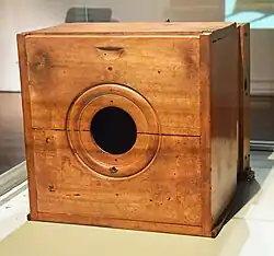 1827. La première photographie connue, le Point de vue du Gras a été prise par Nicéphore Niepce en 1827 à l'aide de cette chambre en bois conservée au musée Nicéphore Niepce de Chalon-sur-Saône. Il s'agit d'une "chambre à tiroir" ou la mise au point s'effectue grâce à une boite ouverte vers l'avant coulissant dans la boite principale qui, elle, est ouverte vers l'arrière. Ce mode de fonctionnement sera utilisé jusqu'à ce que l'utilisation de soufflets se généralise. L'objectif a été égaré [1],[2],[3].