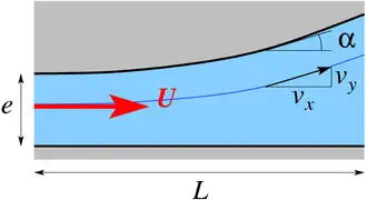 Considérons un liquide fortement confiné entre deux parois, comme représenté sur la figure ci-contre. Afin de simplifier cette étude, on se restreint à un écoulement à deux dimensions (le résultat reste valable pour un écoulement à trois dimensions). On peut projeter l'équation de Navier-Stokes sur les axes et  :