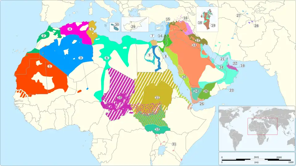 Les langues vernaculaires orales, différentes l’une de l'autre dans chaque région, et influencées par l’arabe standard sont appelées arabe dialectal[15], les substrats, superstrats et emprunts diffèrent selon les régions.