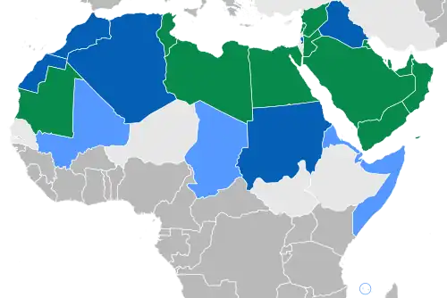 L'arabe est parlé à des degrés divers dans les pays arabes du Moyen-Orient, en Iran (province du Khouzistan), en Turquie (frontière turco-syrienne), en Israël[13], dans les pays d'Afrique du Nord, du Sahara, du Sahel et sur les côtes de la Corne de l'Afrique.