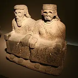 Le dieu de l'Orage sous sa forme hittite, derrière une femme. Zincirli, Pergamon Museum.