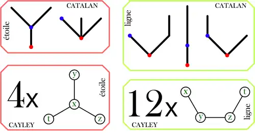 - L'étoile peut être étiquetée de 4 manières (en choisissant librement l'étiquette du centre, parmi 4 possibilités, le choix des étiquettes des 3 feuilles conduisant alors toujours au même arbre). La ligne peut être étiquetée de 4!=24 manières, équivalentes 2 par 2 (par exemple 1234 et 4321 sont équivalents), donc de 12 manières en réalité, ce qui donne 12 + 4 = 16 = 42 arbres de Cayley à 3 arêtes.