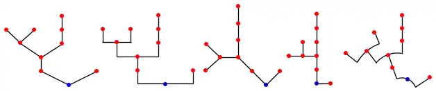 Différentes représentations d'un même arbre. Ici les racines sont en bas. Les deux arbres de gauche montrent les générations, les trois de droite ont leurs arêtes de même longueur.