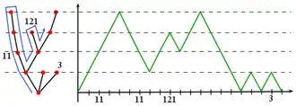 Figure 2 : Arbre fini et sa marche de Łukasiewicz associée.