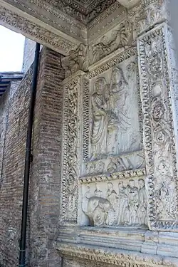 Le passage central n'est pas voûté, mais surmonté d'un plafond en caisson reposant sur deux piliers. L'arc est construit en marbre, excepté la base, qui se compose de blocs de travertin. Il mesure 6,15 mètres de hauteur et le passage central est large de 3,30 mètres[2]. Ornée de pilastres avec des chapiteaux corinthiens, la façade extérieure est entièrement couverte de sculptures décoratives et de reliefs représentant des scènes de sacrifice[2].