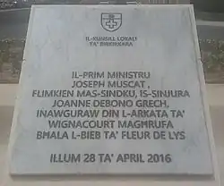 La plaque sur le côté faisant face à Birkirkara disait[1] :