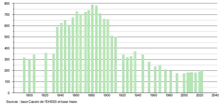 L'évolution du nombre d'habitants est connue à travers les recensements de la population effectués dans la commune depuis 1793. Pour les communes de moins de 10 000 habitants, une enquête de recensement portant sur toute la population est réalisée tous les cinq ans, les populations de référence des années intermédiaires étant quant à elles estimées par interpolation ou extrapolation[16]. Pour la commune, le premier recensement exhaustif entrant dans le cadre du nouveau dispositif a été réalisé en 2004[17].