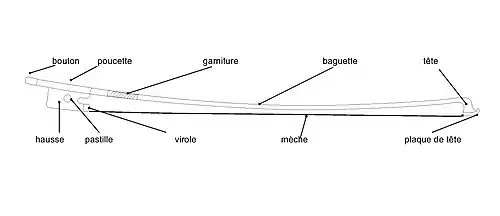 La mèche est constituée de crins de cheval prélevés sur la queue de l'étalon ou du hongre ; ceux de jument, abîmés par l'urine, ne sont pas utilisés[4].