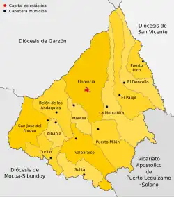 Il comprend les municipalités d'Albania, Belén de los Andaquíes, Curillo, El Doncello, El Paujil, Florencia, La Montañita, Morelia, Puerto Milán, Puerto Rico, San José del Fragua, Solita et Valparaíso du département de Caquetá.