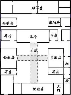 Les maisons traditionnelles avec cour furent fortement influencées par le code de conduite hiérarchique du confucianisme qui marquait une stricte distinction entre l’intérieur et l’extérieur, le supérieur et l’inférieur, l’homme et la femme. Ces lieux clos formaient un monde à part, reclus et isolé du monde extérieur par un mur d’enceinte. Dans l’architecture traditionnelle chinoise, le centre, le nord, la gauche, et l’avant de la maison sont considérés comme supérieurs, et les côtés, le sud, la droite, l’arrière comme inférieurs. De même, l’aile nord est la plus souhaitable, car elle fait face au sud et reçoit le plus de lumière du soleil. La chambre centrale de l’aile nord, en tant que pièce la mieux localisée, faisait office de salle de réception ou de salle des ancêtres. Les chambres est de l’aile nord de la maison étaient occupées par les grands-parents, et celles de l’ouest, par le chef de famille. Les générations les plus jeunes logeaient dans les ailes est et ouest. Le fils aîné et sa famille vivaient dans l’aile est, et le cadet et sa famille dans l’aile ouest. L’aile sud abritait les chambres d’amis, les salles d’études, les cuisines et les réserves. Son entrée principale et ses chambres publiques étaient déviées de la cour intérieure par un mur et une porte décorative, isolant les chambres intérieures d’une intrusion extérieure. Les femmes n’étaient pas autorisées à quitter la cour centrale, et les invités n’avaient pas la permission d’y entrer. De plus grandes enceintes avaient souvent des cours secondaires et des bâtiments utilisés pour loger les fils et les filles célibataires, ou servaient aussi à divers usages.