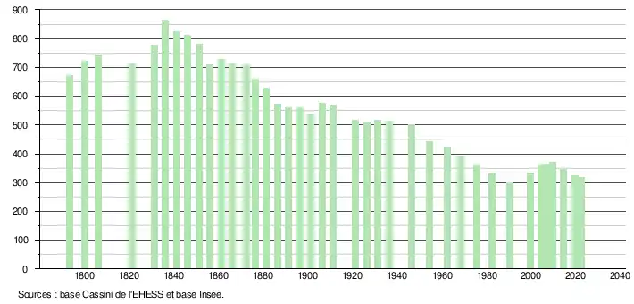 L'évolution du nombre d'habitants est connue à travers les recensements de la population effectués dans la commune depuis 1793. Pour les communes de moins de 10 000 habitants, une enquête de recensement portant sur toute la population est réalisée tous les cinq ans, les populations de référence des années intermédiaires étant quant à elles estimées par interpolation ou extrapolation[25]. Pour la commune, le premier recensement exhaustif entrant dans le cadre du nouveau dispositif a été réalisé en 2004[26].