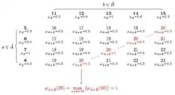 Pour calculer le degré d'appartenance de 18 à l'ensemble flou , il est nécessaire de construire tous les couples de valeurs tels que , et où . En effet, cinq couples voient leur somme égale à 18 et tous peuvent donc être à l'origine de ce résultat. De manière logique, on peut donc écrire :