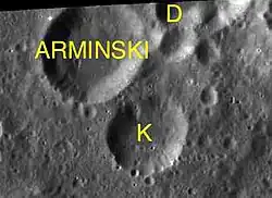 Les cratères dits satellites sont de petits cratères situés à proximité du cratère principal, ils sont nommés du même nom mais accompagné d'une lettre majuscule complémentaire (même si la formation de ces cratères est indépendante de la formation du cratère principal). Par convention, ces caractéristiques sont indiquées sur les cartes lunaires en plaçant la lettre sur le point le plus proche du cratère principal. Liste des cratères satellites de Arminski[5] :