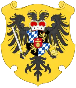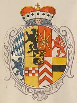 parti de sable au lion d'or contourné armé, couronné et lampassé de gueules (Palatinat du Rhin, contourné) et fuselé en bande d'azur et d'or (Wittelsbach), enté en pointe de gueules à l'orbe crucifère d'or (dignité d'archisénéchal d'Empire)[9]. |