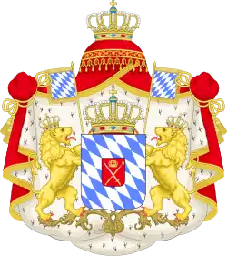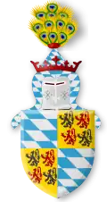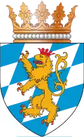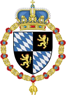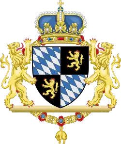 fuselé en bande d'azur et d'argent (Wittelsbach), sur-le-tout au lion d'or, armé, lampassé et couronné de gueules. | |