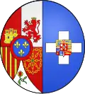 Parti en I, écartelé au 1 de gueules au château d'or couvert et ajouré d'azur (de Castille), au 2 d'argent au lion de gueules armé, lampassé et couronné d'or (de León), au 3 d'or aux quatre pals de gueules, qui est de Aragon, au 4 de gueules aux chaînes d'or posées en orle, en croix et en sautoir, chargées en cœur d'une émeraude au naturel (de Navarre), accompagné en pointe d'argent à une pomme grenade de gueules tigé et feuillé de sinople (de Grenade) et sur le tout d'azur aux trois fleurs de lys d'or à la bourdure de gueules (d'Anjou) et en II, D'azur, à la croix alésée d'argent (de Grèce), sur-le-tout écartelé : à la croix pattée d'argent bordée de gueules, qui est le Danebrog, cantonnée en I, d'or, à neuf cœurs de gueules, posés en trois pals, à trois lions léopardés d'azur, armés et lampassés de gueules, couronnés du champ, brochant sur-le-tout (de Danemark) ; en II, d'or, à deux lions léopardés d'azur, armés et lampassés de gueules (de Schleswig) ; en III, coupé : À d'azur, à trois couronnes d'or (de Suède moderne) et B coupé de gueules à une peau de morue d'argent tenue en pal par une traverse de sable, le tout couronné d'or et coupé d'azur à un bélier d'argent passant lampassé de gueules et armé d'or et d'azur à un ours polaire d'argent armé du premier ; en IV, coupé d'or au lion léopardé d'azur soutenu de neuf cœurs de gueules ordonnés 5 et 4 (du Royaume des Goths) et de gueules au dragon d'or (du Royaume des Vandales) ; sur-le-tout écartelé au 1 de gueules, à la feuille d'ortie d'argent (de Holstein) au 2 de gueules, au cygne d'argent, becqué, membré et colleté d'une couronne d'or (Stormarn), au 3 de gueules, au cavalier armé d'argent (Dithmarse), au 4 de gueules à la tête de cheval coupée d'or (de Lauenbourg) ; sur-le-tout-du-tout parti d'or à deux fasces de gueules (de Oldenbourg) et d'azur, à la croix pattée, au pied fiché d'or (de Delmenhorst). |