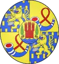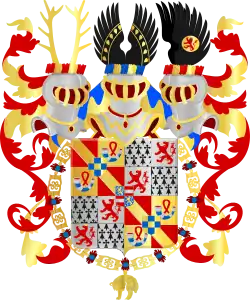 D'azur, semé de billettes, au lion coiffé d'une couronne fermée, le tout d'or, armé et lampassé de gueules, tenant dans sa patte dextre un faisceau de sept flèches d'argent, pointées et empennées d'or, et dans sa patte sénestre, une épée d'argent, garnie d'or, brochant sur le tout[4] le tout brisé d'un lambel de gueules chargé d'une Couronne fermée d'or.[19]