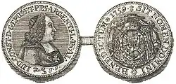 ![]() Louis César Constantin de Rohan-Guéméné dit « le Cardinal de Rohan » (24/03/1697 à Paris – 11/03/1779 à Paris), cardinal, prince-évêque de Strasbourg, commandeur du Saint-Esprit (reçu le 10 juin 1753) De gueules à neuf macles d'or, posées 3, 3, 3.[16] D'après la médaille ci-contre : Écartelé : en 1 et 4 : de gueules à une bande d'argent chargée d'une cotice de sinople (qui est de l'Évêché de Strasbourg); en 2 et 3 : de gueules à la bande d'argent côtoyée de deux cotices fleuronnées du même (qui est de Basse-Alsace) ; sur le tout, écartelé : en 1 et 4 : de gueules aux chaînes d'or posées en orle, en croix et en sautoir, chargées en cœur d'une émeraude au naturel (qui est de Navarre) ; en 2 et 3 : d'azur à trois fleurs de lys d'or, posées 2 et 1 (qui est de France ; sur le tout : parti : en 1 : de gueules à neuf macles d'or, posées 3, 3, 3 (qui est de Rohan) ; et en 2 d'hermine (qui est de Bretagne). |