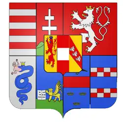 d'or, à l'aigle bicéphale de sable, membrée, becquée et liée de gueules ; sur le tout écartelé, en 1 de gueules au lion d'argent à la queue fourchée passée en sautoir, couronné, armé et lampassé d'or, en 2 fascé d'argent et de gueules, en 3 écartelé en 1 et 4 de gueules au château d'or et en 2 et 3 d'argent au lion de gueules armé lampassé et couronné d'or et en 4 parti de bandé d'or et d'azur en six pièces à la bordure de gueules et de coupé d'argent à l'aigle de gueules éployé, membré, langué et becqué d'or et d'or au lion de sable armé et lampassé de gueules ; sur le tout de gueules à la fasce d'argent[1]. |