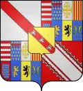 Écartelé : au 1er d'argent à l'aigle de sable, au chef d'azur chargé d'un soleil d'or mouvant de l'angle dextre, au 2d d'azur à la tour crénelée de cinq pièces d'argent ouverte, ajourée et maçonnée de sable, au chef cousu de gueules chargé de trois heaumes d'or tarés de profil, au 3e d'azur à la tour d'argent maçonnée de sable sur un rocher d'or, au chef cousu de gueules chargé de trois étoiles d'or, au 4e d'argent à la bande de gueules chargée, en chef, d'une étoile du champ à plomb.