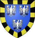 Armes : D'argent au vol renversé de sable[13]. Cimier : un vol de sable. Supports : deux loups marins au naturel. Devise : TOVT POVR LA VIE Variante : vol non renversé.![]() | |