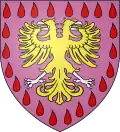 Armes : De pourpre à l’aigle bicéphale d’or membrée et becquée de gueules, à la fasce de sinople brochant[6]. Cimier : une tête d'aigle d'or, becquée de gueules. Supports : deux aigles d'or, becquées et membrées de gueules. Devise : NÉ POVR MOVRIR | |