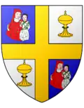 Écartelé d'azur et d'argent à la croix d'or brochante, cantonnée aux 1er et 4e d'une Vierge de carnation, habillée de gueules, tenant l'Enfant-Jésus au naturel, lequel tient de la main dextre un pampre de vigne de sinople ; aux 2d et 3e d'un ciboire d'or |