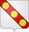 D'azur semé de besants d'or, au lion d'argent, la queue contournée, armé de gueules et lampassé d'or. |